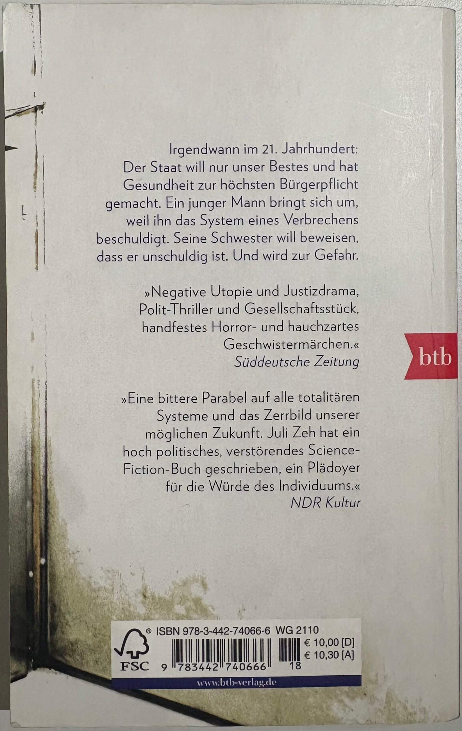 Produktdetails: Autorin: Juli Zeh, Genre: Roman / Dystopie / Politische Literatur, Themen: Gesundheit, Kontrolle, Freiheit, Recht, Moral, Geeignet für: Schule (Sek II), Jugendliche, Literaturinteressierte